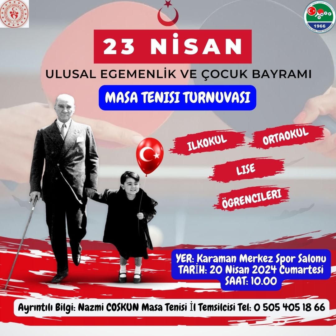 23 Nisan Çocuk Bayramı nedeniyle İlimiz Merkez Spor Salonunda 20 Nisan 2024 Cumartesi günü saat 10.00'da Masa Tenisi Turnuvası düzenlenecektir.