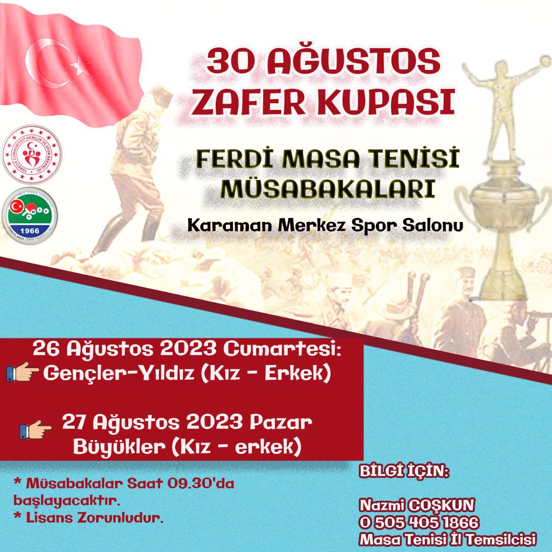 30 Ağustos Zafer Bayramı nedeniyle Ferdi Masa Tenisi Müsabakaları düzenlenecektir.